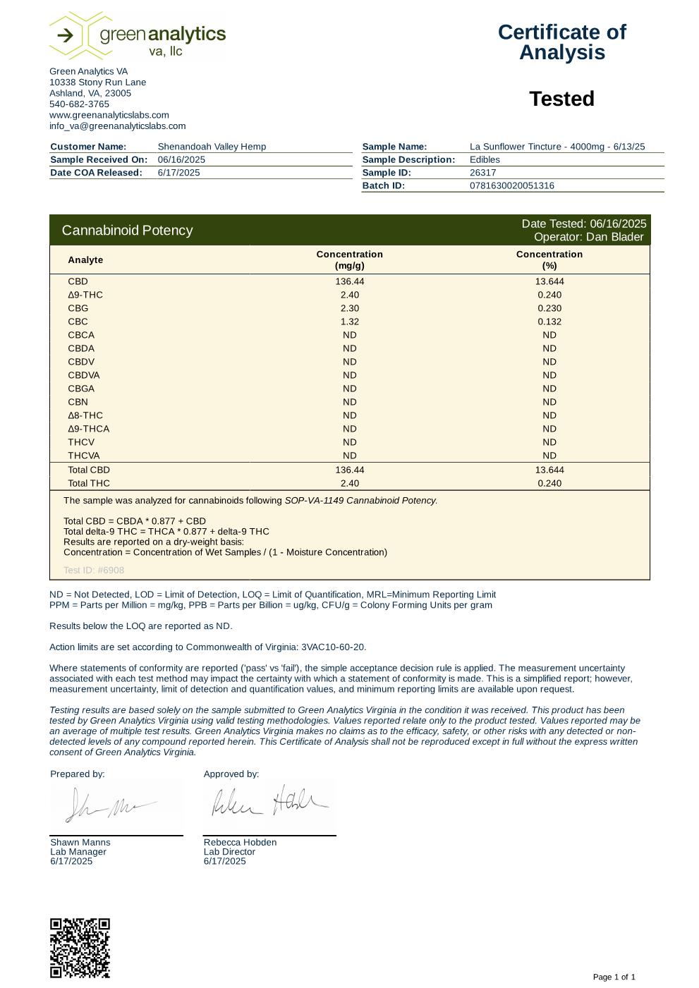 Certificate of Analysis 6-13-25 Batch 0781630020051316